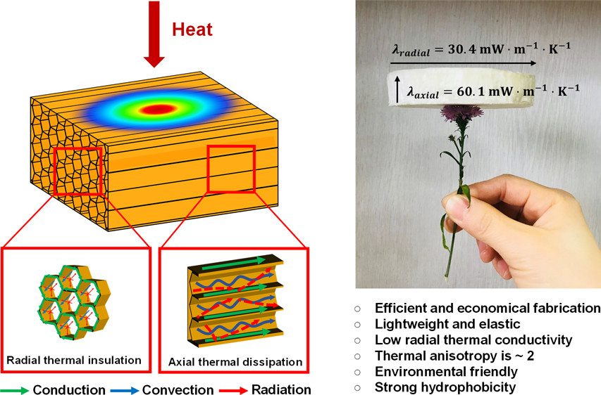 在隔熱保溫領域,課題組通過單向冷凍鑄造和硅烷化改性制備了一種輕質、大尺寸、有彈性、具有優異熱管理能力的各向異性殼聚糖氣凝膠。使用理論計算分析了微觀結構對力學和熱性能的影響,以及各向異性傳熱行為。各向異性殼聚糖氣凝膠呈現蜂窩狀多孔和層狀結構,從而具有先進的熱管理能力,其徑向熱導率較低(30.4 mW m-1 K-1)而軸向熱導率高出兩倍(60.1 mW m-1 K-1)。計算結果表明,各向異性殼聚糖氣凝膠的熱管理能力優于各向同性材料(熱導率分別為10和22 mW m-1 K-1)。這為進一步設計用于超隔熱應用的生物聚合物氣凝膠提供了參考。(ACS Sustainable Chemistry & Engineering. 2021, 9, 28, 9348-9357)
