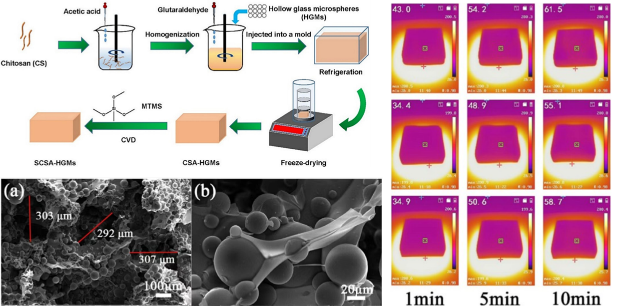 殼聚糖氣凝膠/空心玻璃微球復合材料的制備流程、電鏡圖和隔熱性能