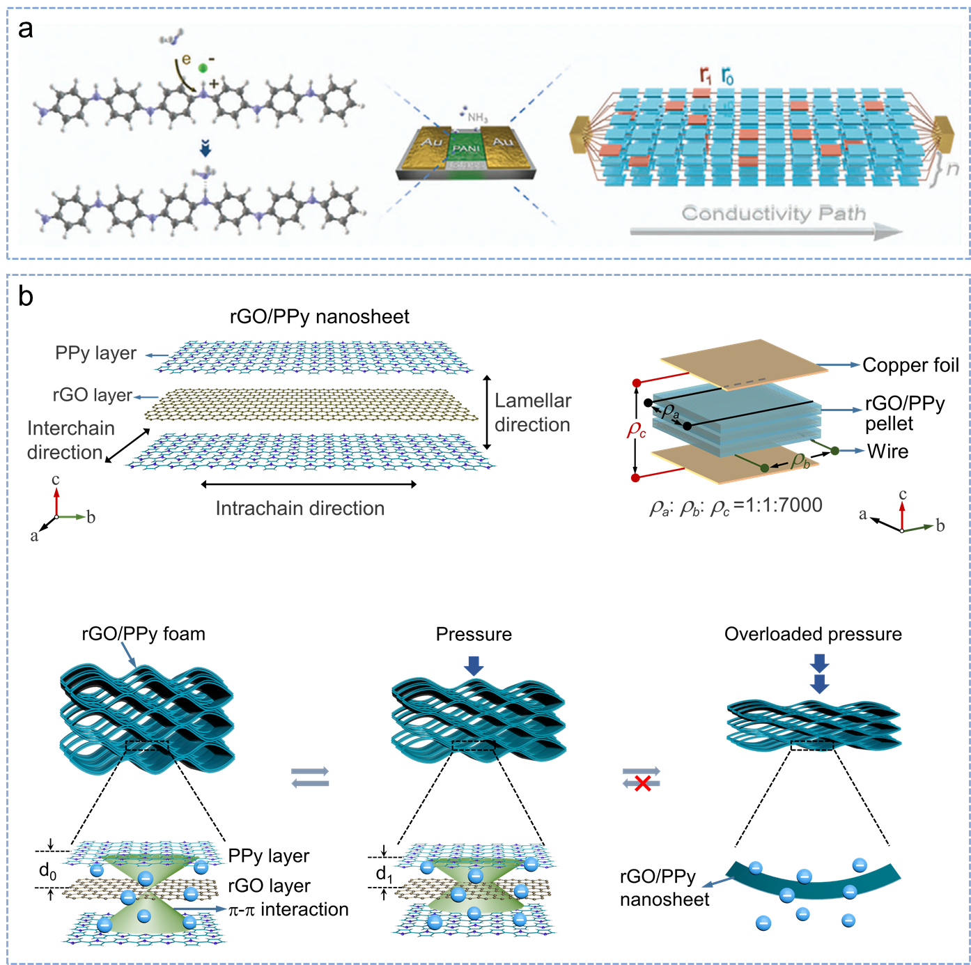 基于上述有序?qū)щ姼叻肿涌煽刂苽洳呗裕瑘F(tuán)隊在分子尺度上實現(xiàn)了導(dǎo)電高分子材料的精確結(jié)構(gòu)設(shè)計、制備、調(diào)控和導(dǎo)電機(jī)制解析,為其在高性能器件和先進(jìn)智能材料領(lǐng)域的應(yīng)用提供了材料基礎(chǔ)和理論依據(jù)。在傳感領(lǐng)域,團(tuán)隊通過提升高分子鏈有序性,促進(jìn)載流子高效輸運(yùn),從而提升傳感器的靈敏度、選擇性和穩(wěn)定性(圖2a)。在距離/壓力傳感方面,通過引入半剛性高有序?qū)щ姼叻肿樱@著提升了材料機(jī)械強(qiáng)度與器件靈敏度(圖2b)。在熱敏傳感方面,團(tuán)隊通過原位無溶劑聚合在多類基底上制備出高度有序納米薄膜。這些薄膜材料均表現(xiàn)出優(yōu)異的熱響應(yīng)特性,其有序結(jié)構(gòu)顯著提升了材料的載流子熱激活輸運(yùn)效率,實現(xiàn)了超高的溫度分辨率與靈敏度。