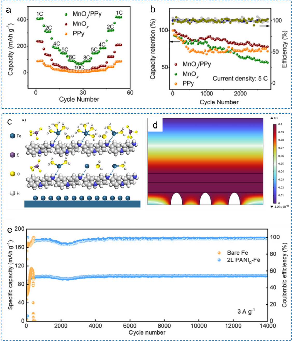 在新能源領(lǐng)域,二維有序?qū)щ姼叻肿拥囊朐谔岣唠娮雍碗x子傳輸效率的同時,可有效緩解充放電過程中電極材料的體積膨脹(圖3a和b)。在金屬負(fù)極方面,采用雙層有序二維導(dǎo)電高分子薄膜作為鐵負(fù)極材料的保護(hù)層,可以促進(jìn)鐵離子均勻沉積(圖3c和d),顯著提升電池循環(huán)壽命和倍率性能(圖3e)。
