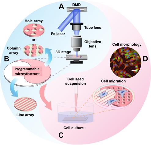 生物材料表面的微觀形態(tài)特征對細胞增殖、黏附和分化至關重要。然而,表面特性調控細胞行為的具體機制仍不明確,目前用于細胞調控的表面設計往往過于單一,難以同時滿足高精度制造與結構多功能性的雙重要求。飛秒激光無掩模光學投影光刻技術(Fs-MOPL)采用數字微鏡器件(DMD)作為掩模板,可以快速制造高精度大面積的可編程細胞芯片,實現(xiàn)對細胞浸潤性的調控。