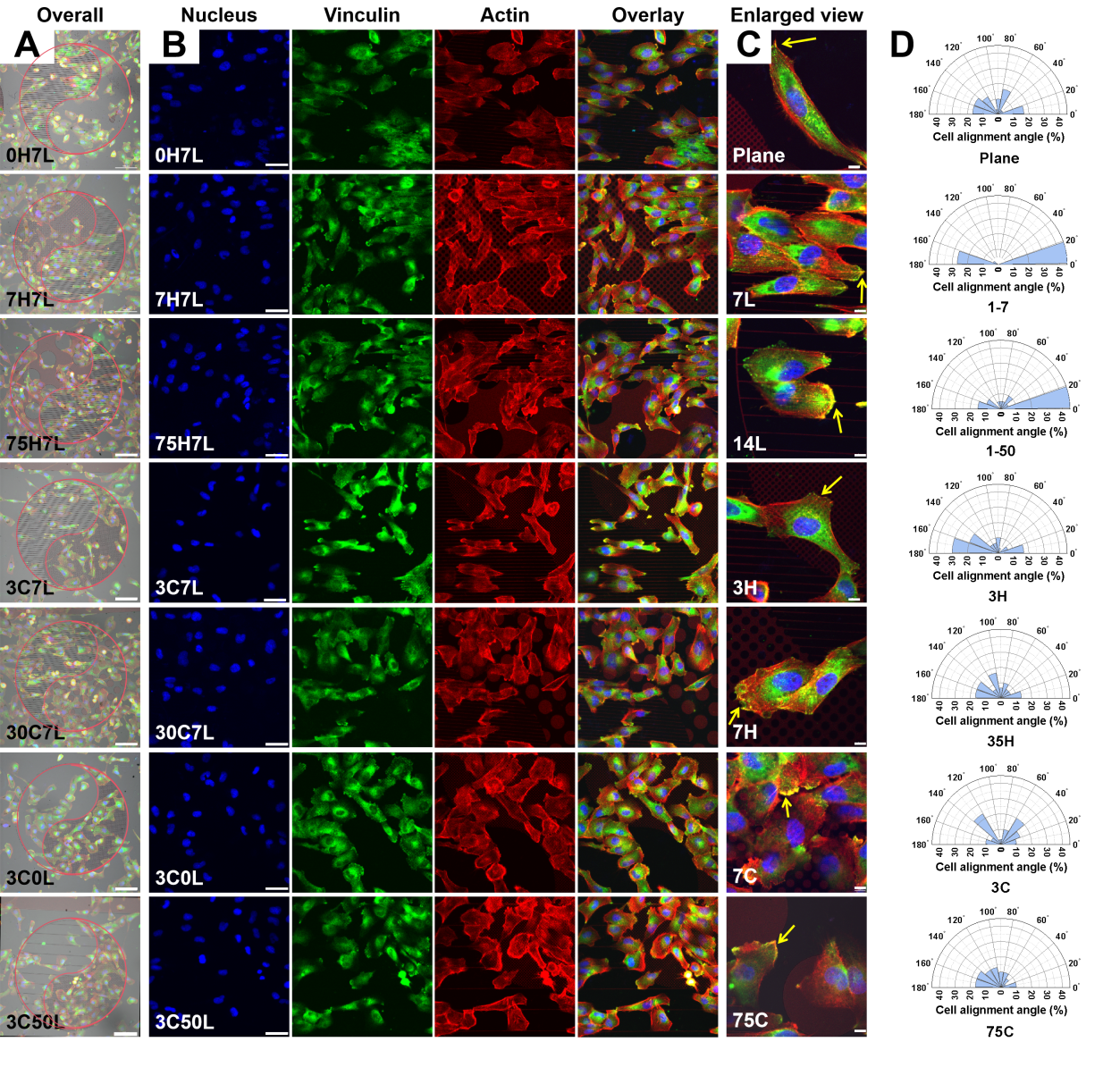 研究人員利用飛秒激光無掩模光學投影光刻AZ P4620光刻膠制備的芯片結構展現(xiàn)出高結構保真度和均勻性。通過O2等離子體和PDL涂覆等表面處理工藝,顯著提升親水性,促進細胞黏附與增殖。通過免疫熒光染色和共聚焦顯微鏡觀察,可編程細胞培養(yǎng)芯片結構對786-O細胞的遷移、黏附及形態(tài)變化具有定向調控能力。細胞對線間距、柱直徑和孔徑等結構參數的變化表現(xiàn)出明顯響應差異。值得注意的是,在線陣列結構上培養(yǎng)的細胞呈現(xiàn)拉長形態(tài)并形成排列整齊的肌動蛋白應力纖維,而柱陣列和孔陣列對黏著斑分布有顯著影響。生物相容性驗證證實該可編程細胞培養(yǎng)芯片適用于細胞培養(yǎng)和組織工程應用。